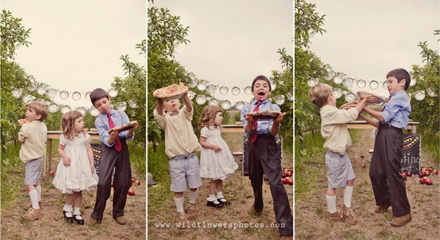 I am completely smitten with this adorable family photoshoot! What's not to love?... a super cute family, delicious pies, vintage furniture props, an orchard and a fun pie eating contest. This is such a fabulous and unique way to capture a family portrait.