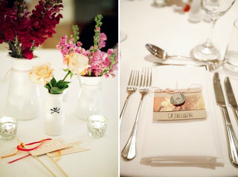 Their reception was held at the Mirra. Their table centres were styled with tea lights and quirky milk jugs filled with colourful snap dragons and roses from the flower markets (that Jaimee and JK picked out themselves a few days before). Guests found their seats with individual vintage soda bottles and name tags. They were given cute little badge favours made by The Hungry Workshop.